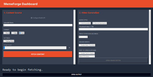 MemeForge is an easy-to use automatic video creator that saves a ton of time on editing and polishing. Choose which subreddit you would like to get images from, decide which song you'd like to have, choose your text-to-speech voice, and voila! Your new video is complete in minutes! Take a coffee break while you wait for the videos to render, and start posting on YouTube, Instagram, TikTok, and Facebook. You'll be sure to rack up views in no time and little effort.